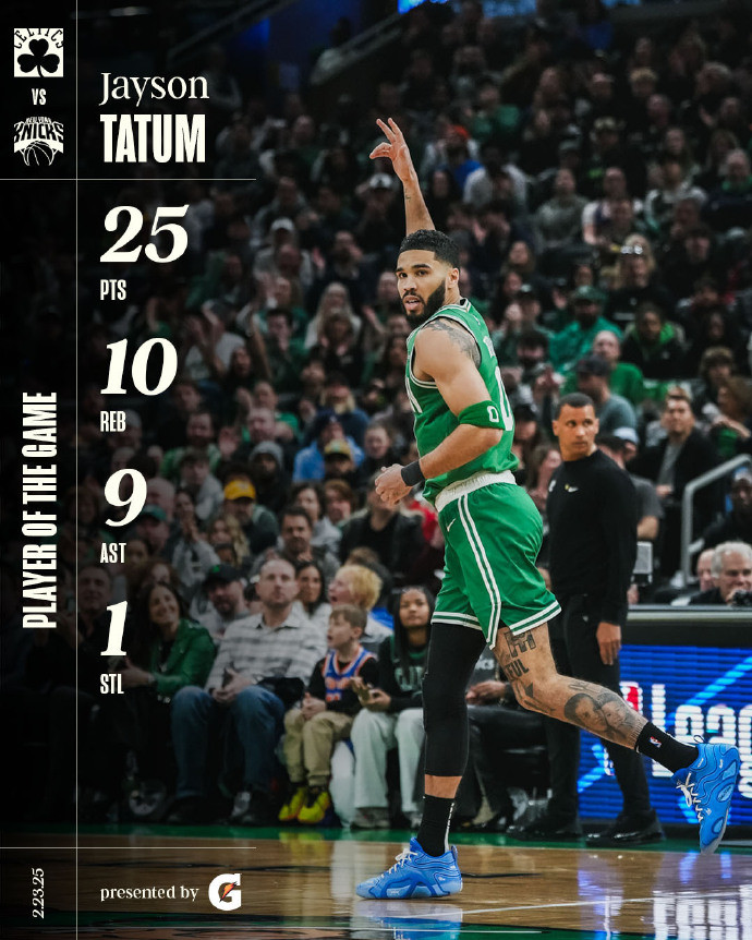 绿军首发五人组全部得分上双,都得到至少14分。塔图姆表现不俗,出战36分钟,投篮20中8,三分10中3,罚球6中6,砍下25分10篮板9助攻的准三双,正负值+12。上半场塔图姆12中6,三分4中1,就已经得到17分6篮板3助攻。本赛季对阵尼克斯的3场比赛,塔图姆场均可以得到34分6.7篮板7.7助攻。